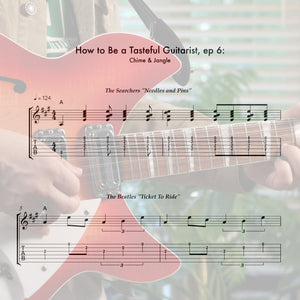 Lesson description: The four ingredients of a jangly guitar hook: Arpeggiation, Suspension, Syncopation, and Drone Strings.